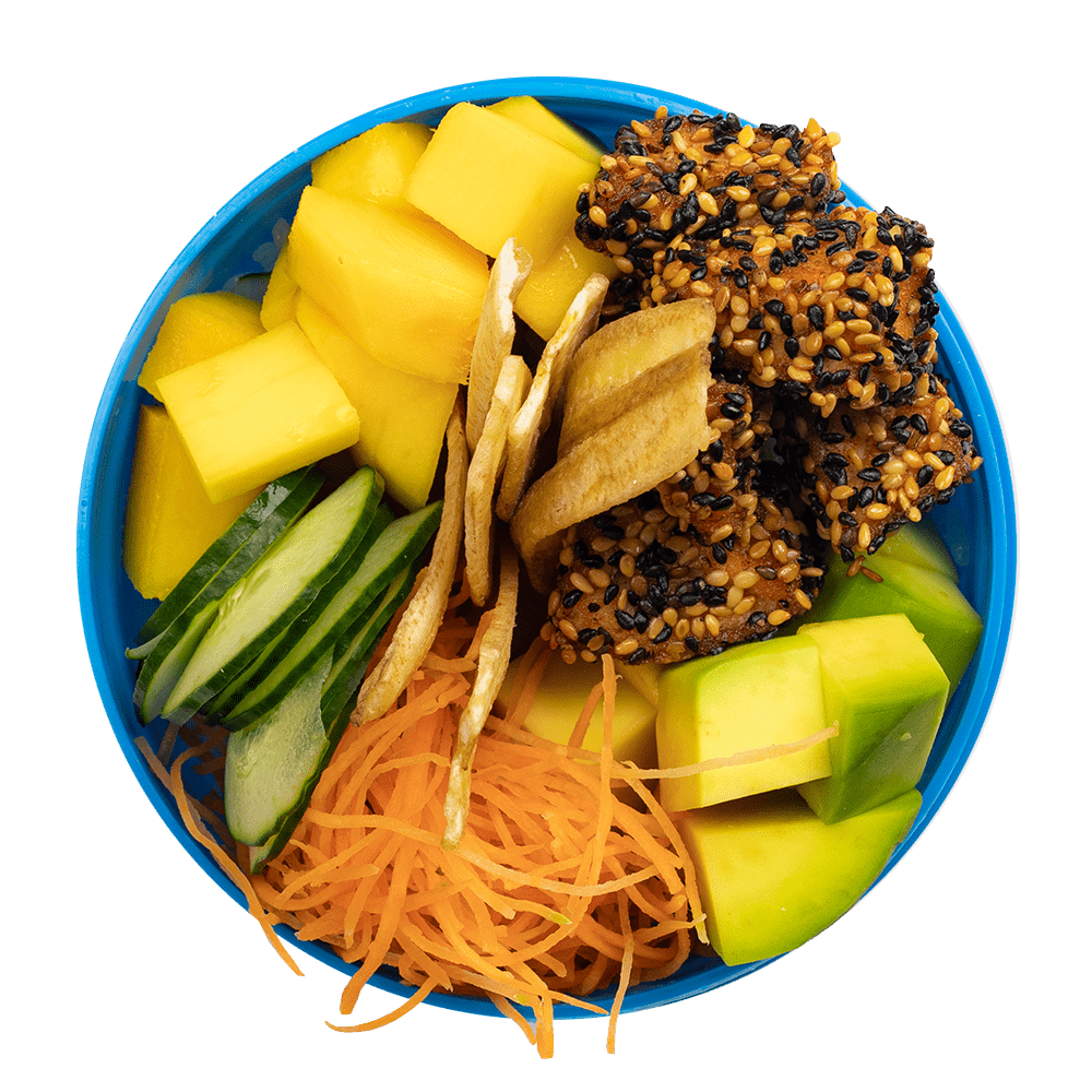 Arroz Japonês, Salmão Grelhado, Manga, Abacate, Cenoura,